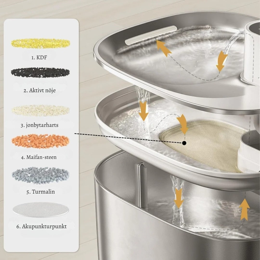 6-lagers filtersystem Tar bort hår, damm, smuts och bakterier för rent och hälsosamt dricksvatten.